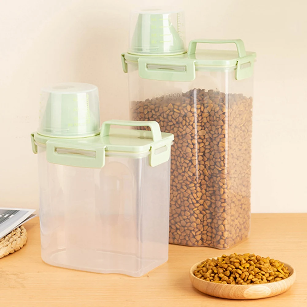 Name: Alimentador de plástico para mascota, contenedor de comida para perro y gato de gran capacidad, caja fresca sellada antioxidación, tanque de almacenamiento de aperitivos con taza medidora